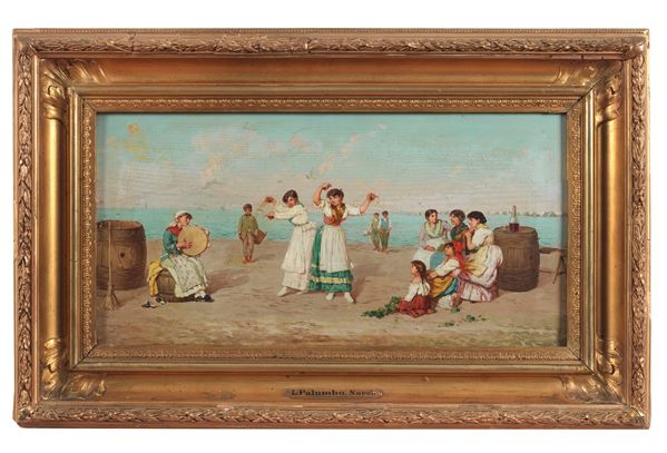 Attribuito. "La tarantella napoletana", piccolo dipinto ad olio su tavoletta di brillante tratto pittorico