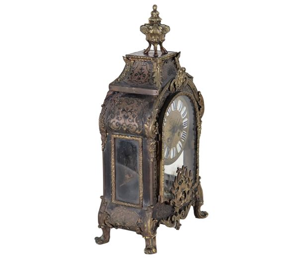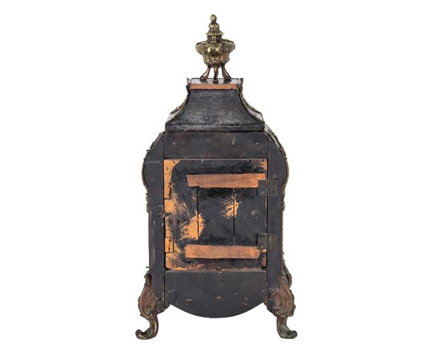 Pendola da tavolo francese Boulle Napoleone III, a finta tartaruga nera con intarsi e fregi in bronzo dorato e cesellato, quadrante a cifre [..]