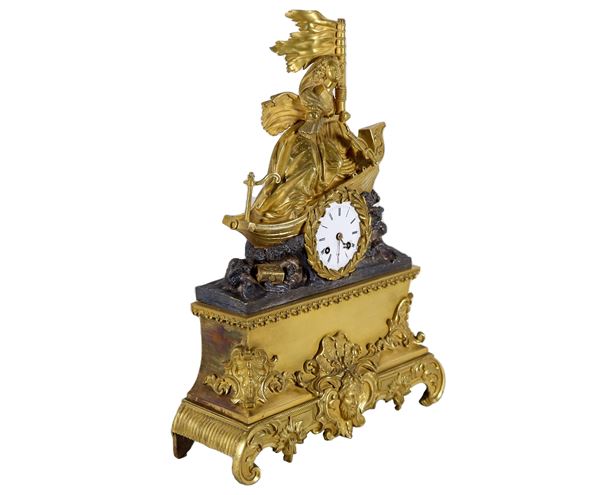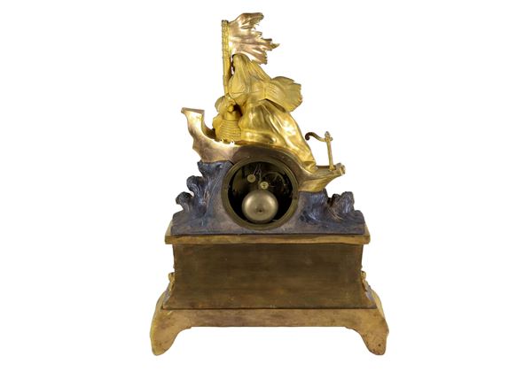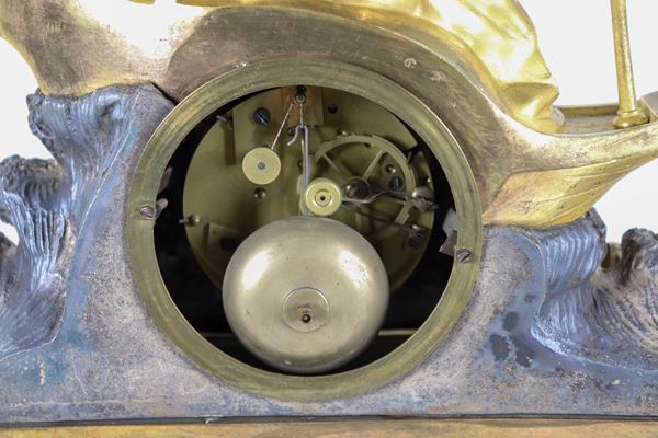 Pendola da tavolo francese in bronzo dorato, sbalzato e cesellato, sormontata da gruppo scolpito "Barca con dama e stendardo", quadrante in [..]