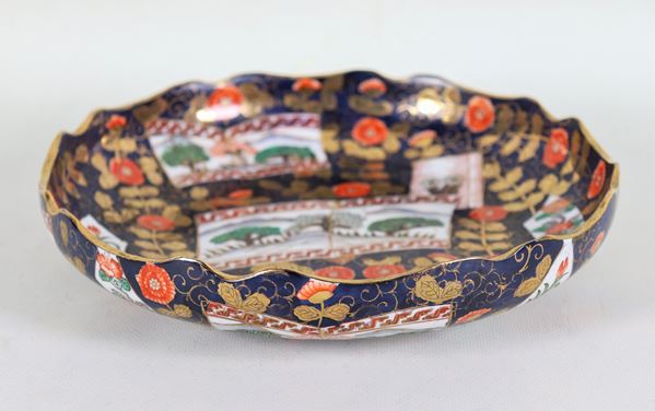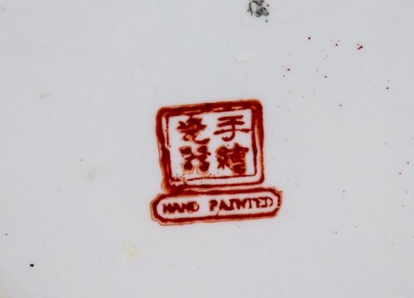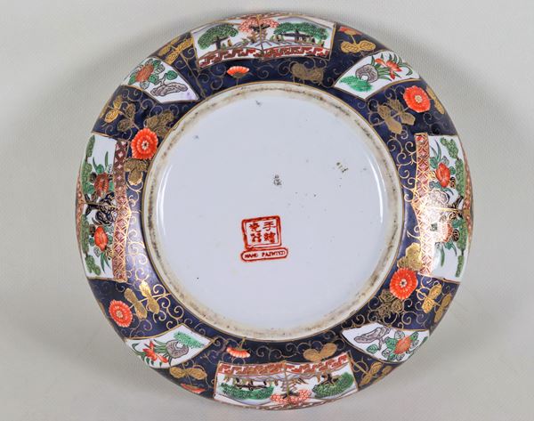 Piatto cinese con bordo centinato in porcellana, interamente decorato con smalti policromi a rilievo a motivi di paesaggi e fiori esotici dor [..]
