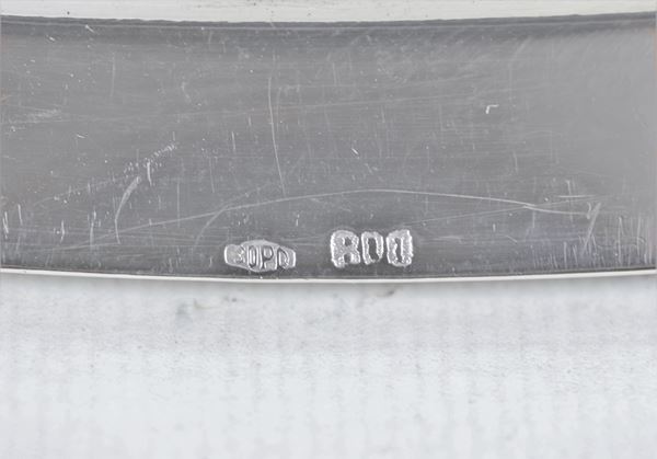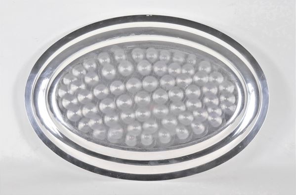 Piatto ovale da portata in argento, con bordo cesellato a palmette neoclassiche, gr. 930