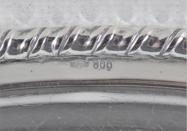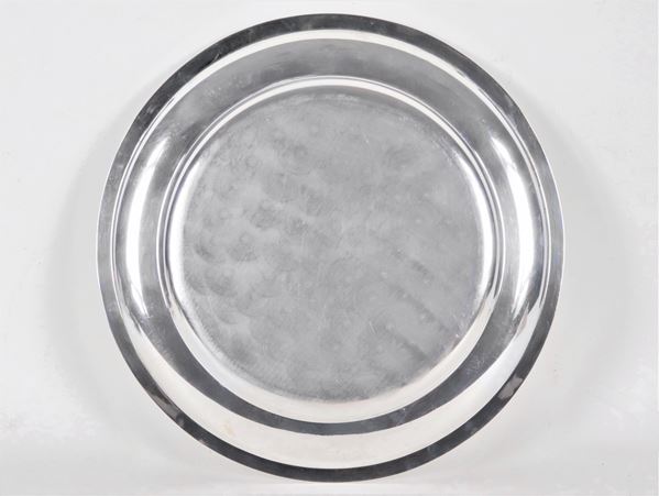 Piatto tondo da portata in argento con bordo a baccellature, gr. 530