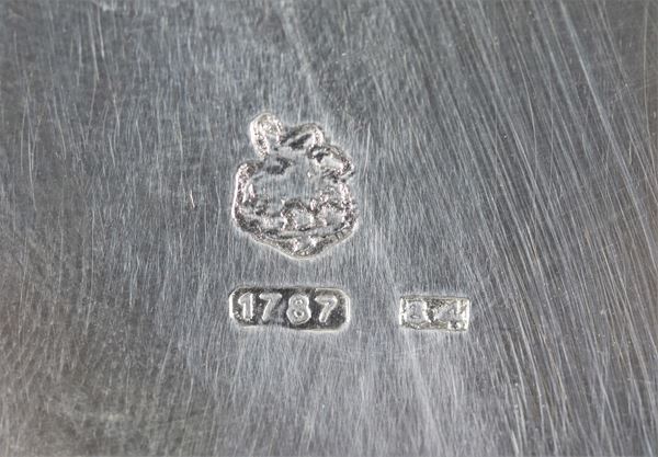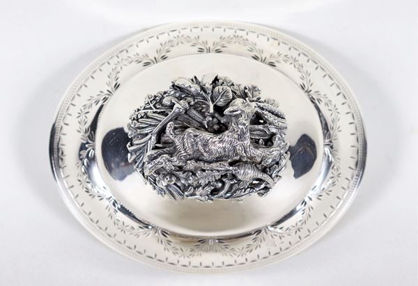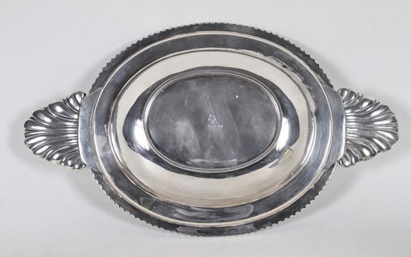 Piccola legumiera in argento a forma ovale, cesellata e sbalzata a motivi Luigi XVI, con manici a forma di conchiglie e pomo con sculturina [..]