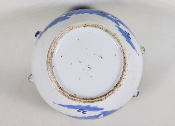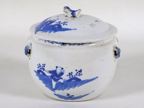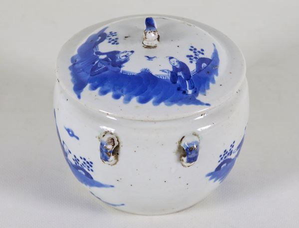 Piccola potiche in porcellana bianca, con decorazioni in blu a motivi di personaggi