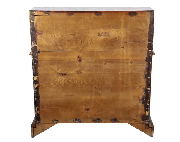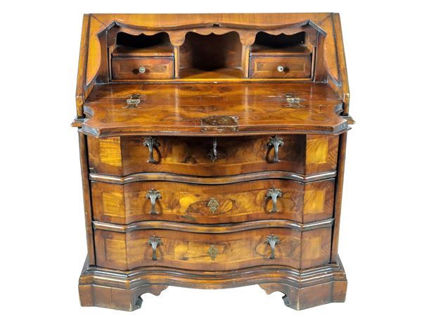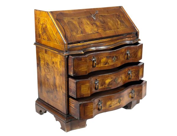 Piccola ribalta veneta di linea Luigi XV, in noce e radica di noce con intarsi a filettature in bosso