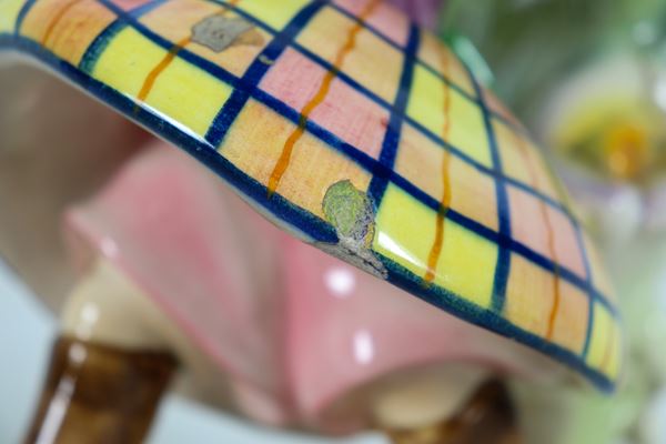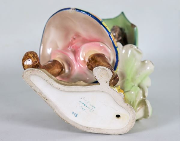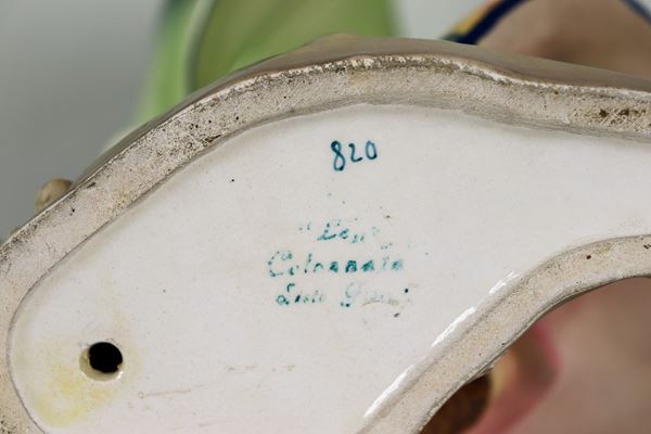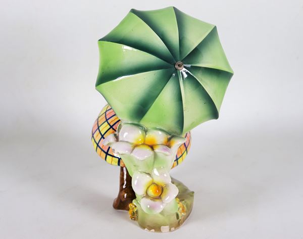 Piccola scultura "Bambina con ombrello" in maiolica smaltata e porcellanata