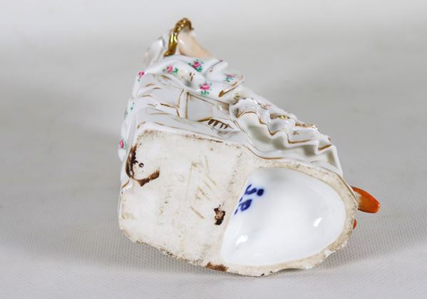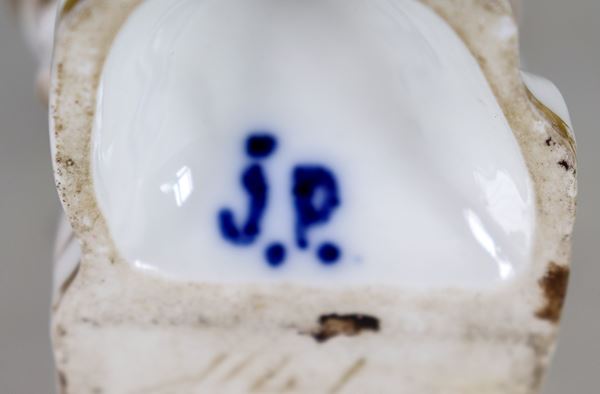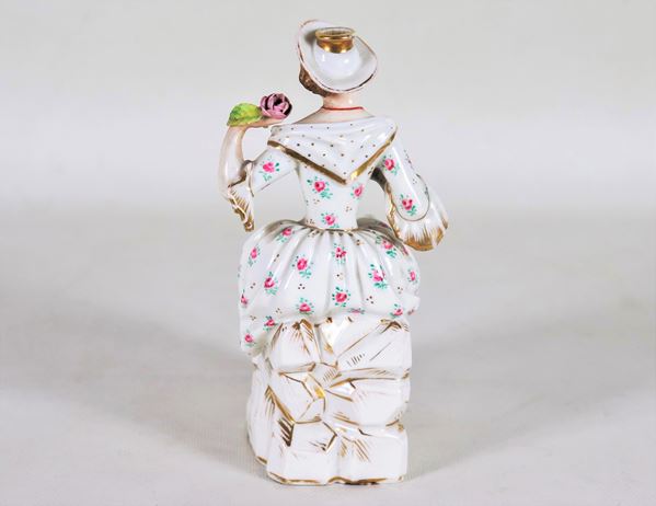 Piccola scultura in porcellana policroma "Giovane dama con rosa", firmata Jacob Petit