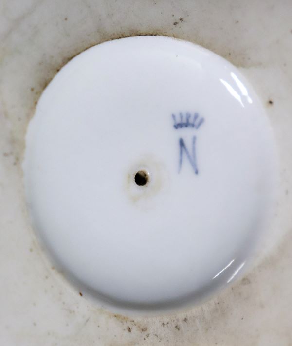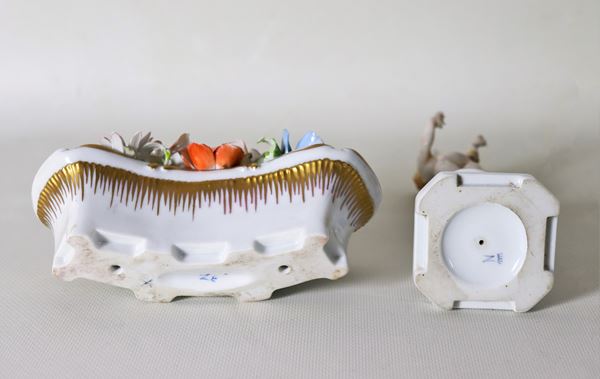 Piccolo centrotavola in porcellana policroma Capodimonte, composto da quattro vasche con mazzi di fiori e statuina di putto al centro [..]