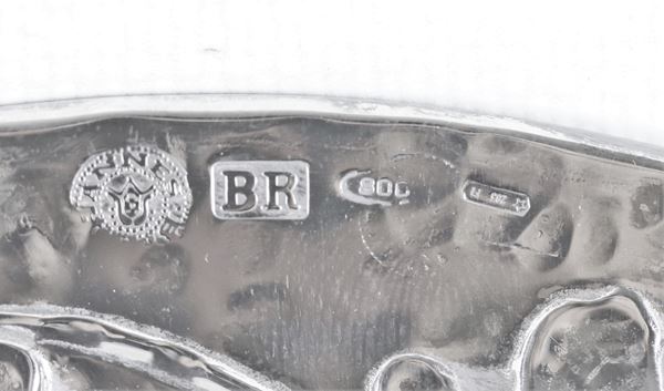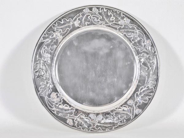 Piccolo piatto tondo in argento, con bordo cesellato e sbalzato a motivi di ghiande e foglie, gr. 270