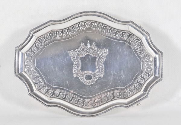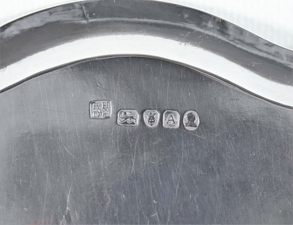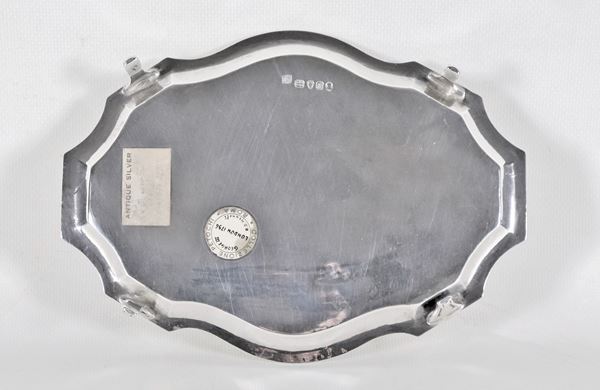 Piccolo salver in argento Epoca Giorgio III, a forma ovale centinata, sorretto da quattro piedini ricurvi, gr. 150