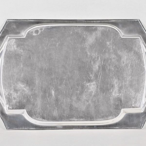 Piccolo vassoio esagonale in metallo argentato, con bordo cesellato e sbalzato a rilievo a motivi Luigi XVI