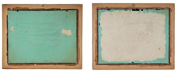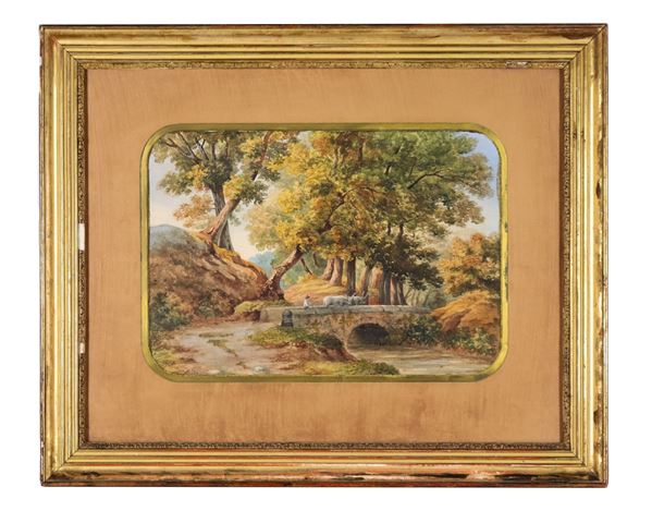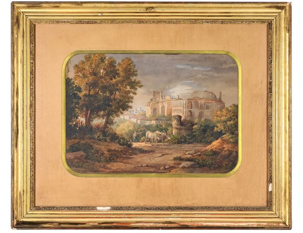 "Paesaggi con contadini, armenti e vedute di città", coppia di acquarelli su carta