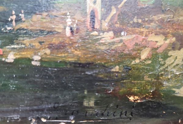 Firmato. "Veduta di Ariccia con il ponte", piccolo dipinto ad olio su tavoletta