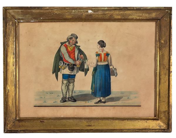 cornici in legno dorato dell'epoca. Un acquarello presenta difetti alla carta, cm 21,5 x 30,5 ciascuno.