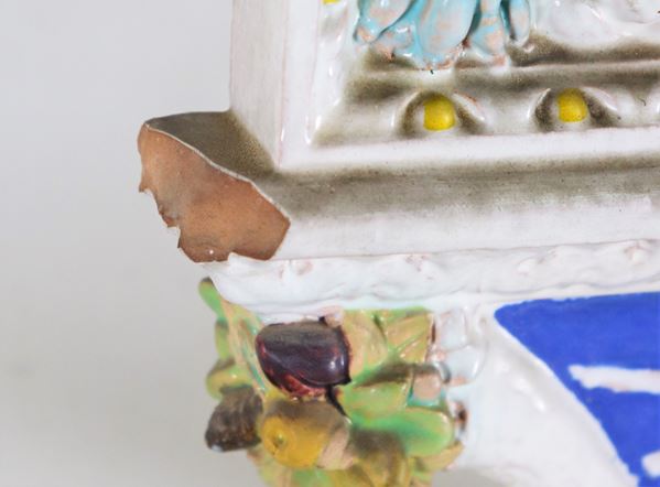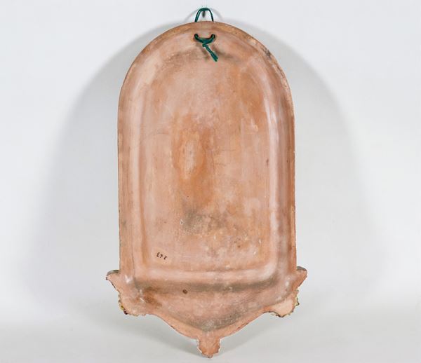 Placca a sesto ovale "Madonna con Bambino e Angeli", in terracotta smaltata, lustrata e policroma