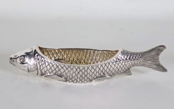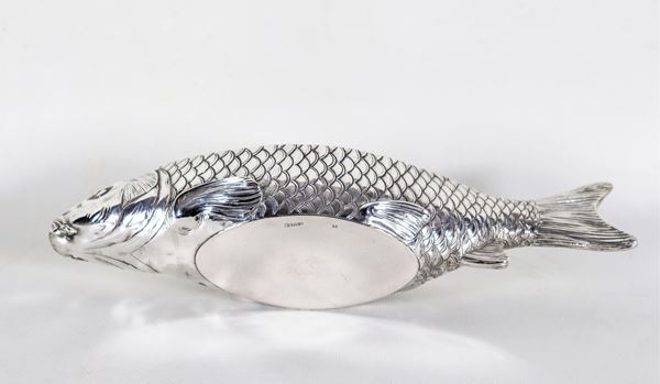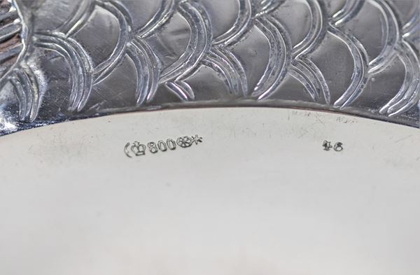Portabonbon a forma di pesce in argento cesellato e sbalzato, gr. 260