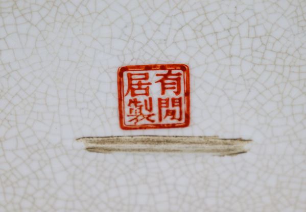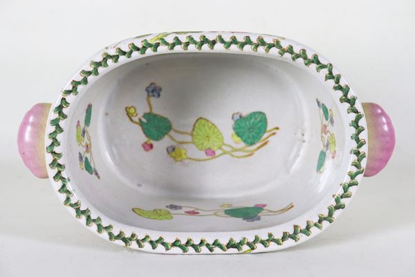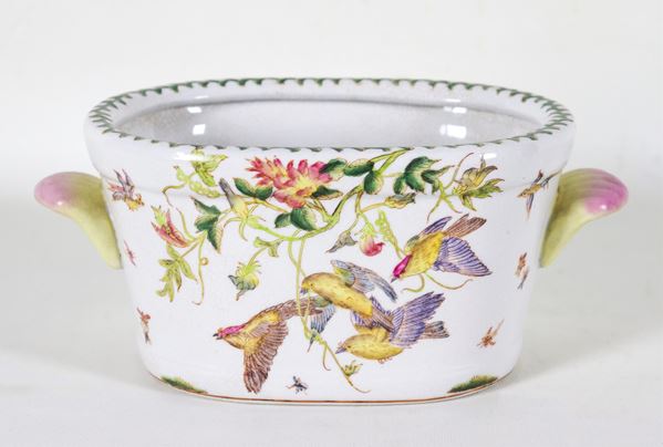 Portafiori cinese a forma ovale in porcellana, con decorazioni variopinte a motivi di fiori e uccelli esotici