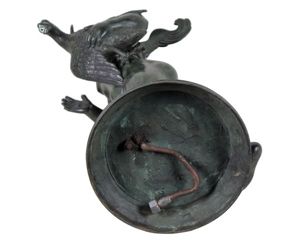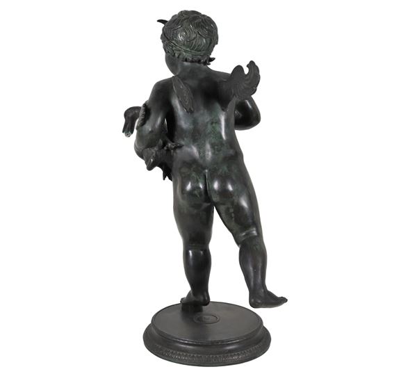 "Putto alato con cigno", scultura neoclassica in bronzo patinato