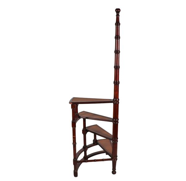 Scaletta da biblioteca in mogano con montante a colonnina tornita, quattro gradini con pianetti in pelle.