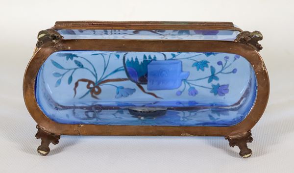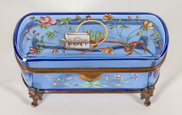 Scatola Liberty francese in cristallo celeste, con applicazioni di smalti a rilievo a motivi di fiori, foglie e fiocchi, sorretta da quattro [..]