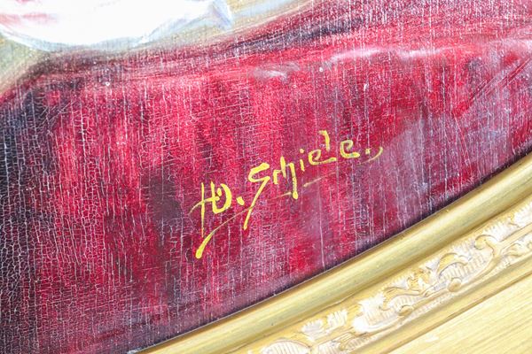 Firmato. "Vaso con mazzo di peonie", dipinto ovale ad olio su compensato
