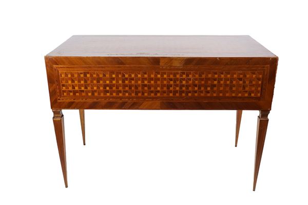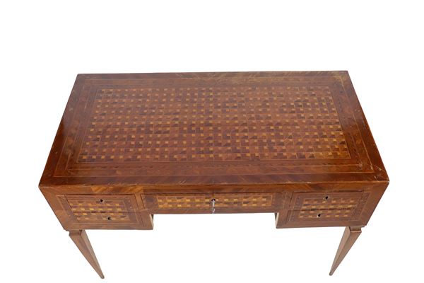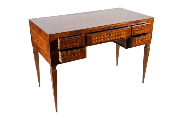 Scrivania da centro ferrarese Luigi XVI in noce, ebano viola e bois de rose, interamente intarsiata a marchetterie con motivi geometrici