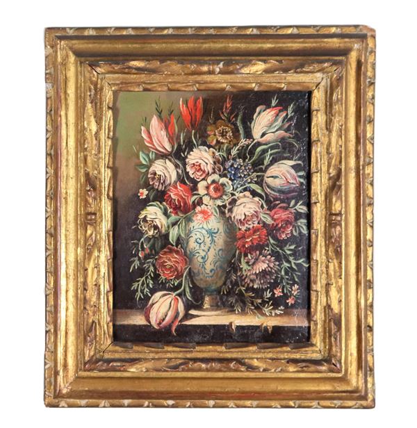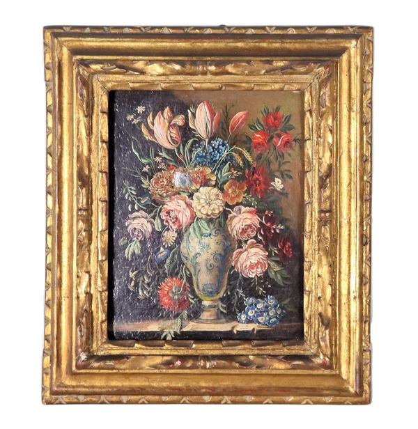 "Nature morte con vasi e mazzi di fiori", coppia di piccoli dipinti ad olio su tela