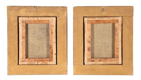 Un dipinto presenta difetto alla tela. Cornici in legno dorato e laccato nero, cm 30 x 23 ciascuno.