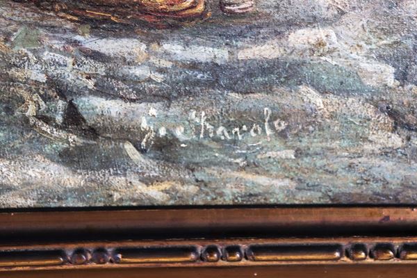 Firmato. "Marina con veduta di costa, porticciolo e barche di pescatori", dipinto ad olio su tela