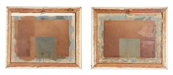 cornici laccate bianche e passepartout, cm 13 x 20 ciascuno.