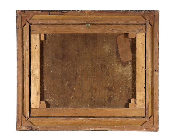 cornice in legno laccato nero con profili dorati. Il dipinto presenta restauri, cm 51 x 63.