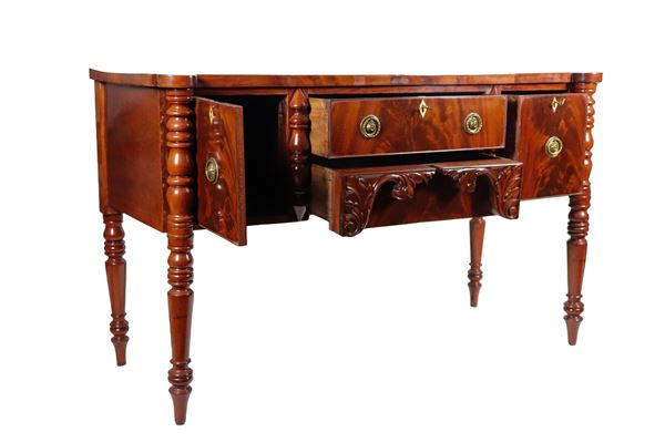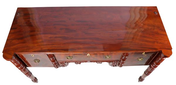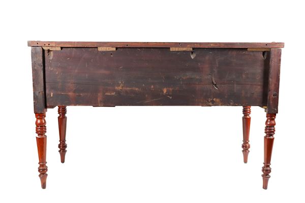 Servante inglese Epoca Regina Vittoria in mogano e piuma di mogano, un tiretto centrale e tiretto segreto sottostante, ai lati sportellino e [..]
