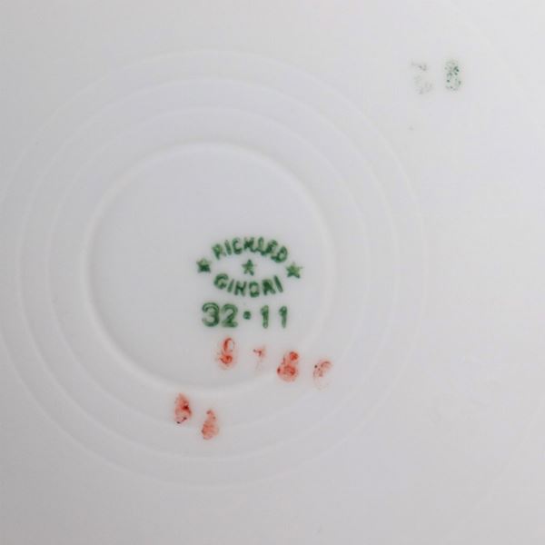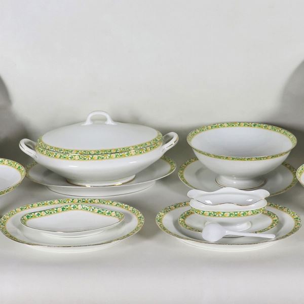 composto da: 11 fondine, 35 piatti piani, 12 piattini, 1 zuppiera ovale, 1 insalatiera, 2 fruttiere ad alzata, 1 burriera, 1 salsiera, 1 piatto tondo da portata e 3 piatti ovali da portata di varie misure. Alcune sbeccature ai bordi, un piatto piano presenta rottura.