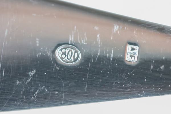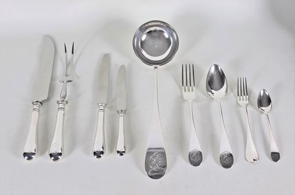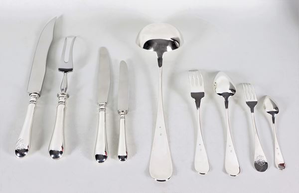 composto da: 6 cucchiai, 6 forchette grandi, 6 coltelli grandi, 6 forchette piccole leggermente differenti nel manico con monogramma inciso sul retro, 6 coltelli piccoli, 2 piccoli cucchiai per salse, 1 mestolo e 2 posate per arrosti.