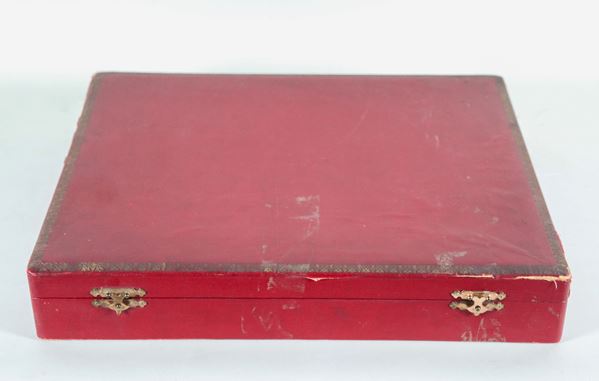 Servizio di posate per sei persone in argento cesellato con monogramma inciso, astuccio in pelle rossa (35 pz), gr. 1350