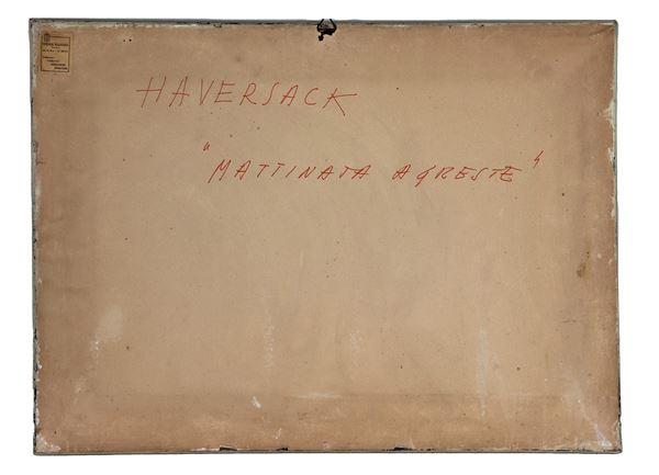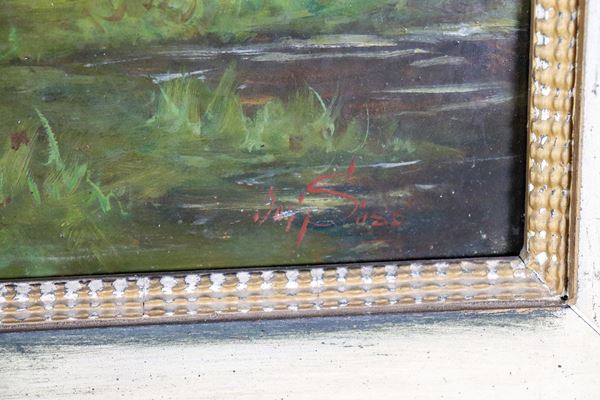 Firmato. "Paesaggio con pastorello e gregge di caprette", piccolo dipinto ad olio su cartone pressato