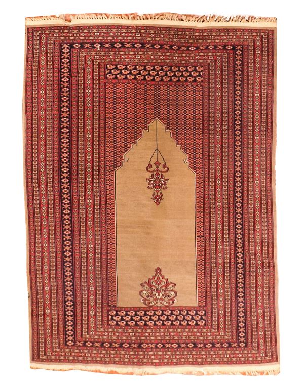 Tappeto Baku a preghiera su fondo avana e rosso, M. 1,86 x 1,27