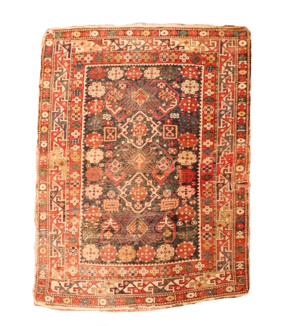 Tappeto Kazak a disegni geometrici e floreali su fondo blu e rosso, difetti alle bordure, M. 1,53 x 1,13