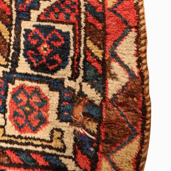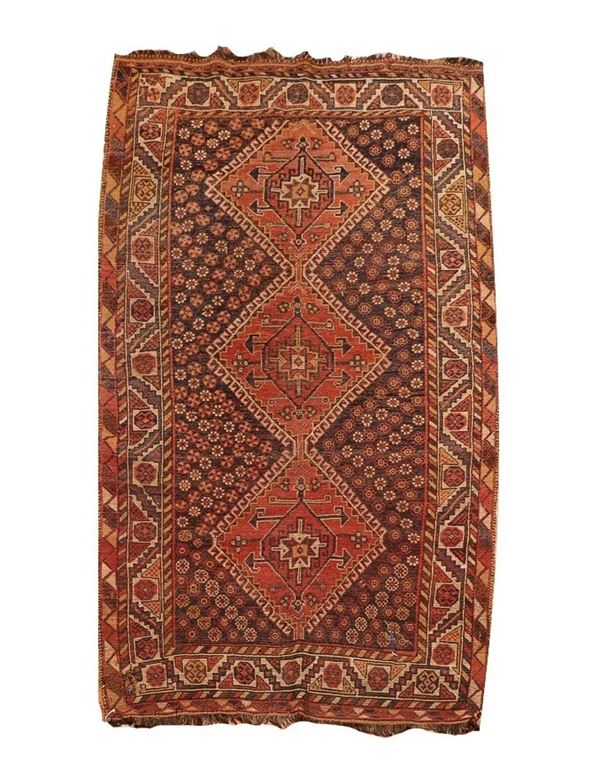 Tappeto Shirvan a rombi rossi su fondo blu, rapè e difetti alla bordura, M. 2,58 x 1,46