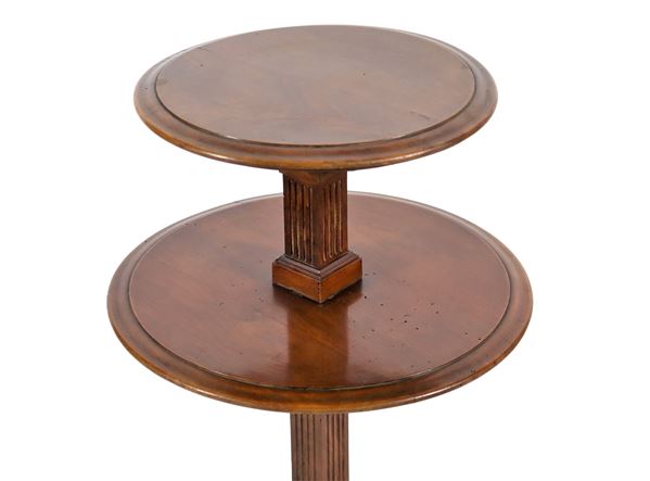 Tavolinetto da centro in noce a due piani, con centrale a colonna e quattro gambe ricurve