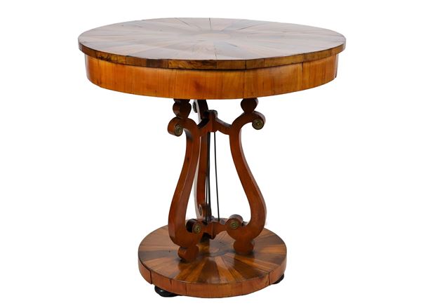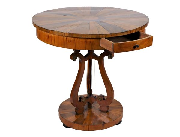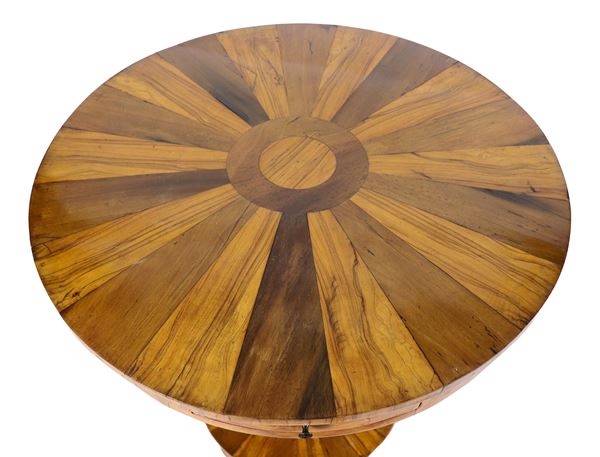Tavolino da centro emiliano a forma tonda, in noce e radica di ulivo, con piano impiallacciato a spicchi e tiretto centrale, base a forma di [..]