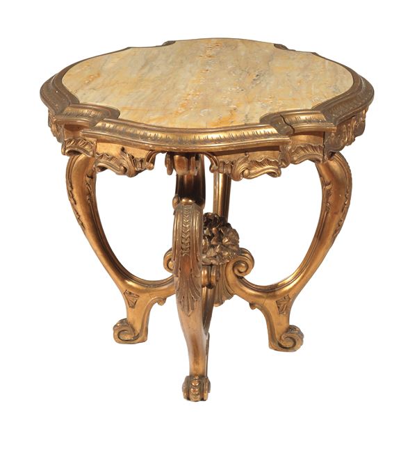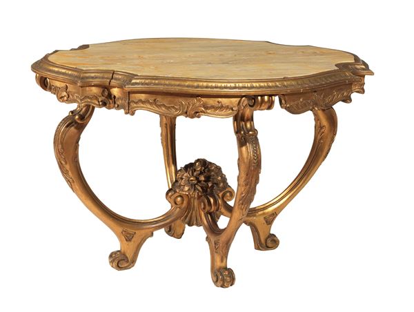 Tavolino da centro ovale in legno dorato ed intagliato, con quattro gambe ricurve riunite da crociera sagomata sormontata da cesto di fiori, [..]