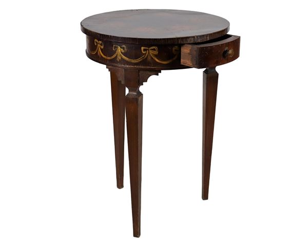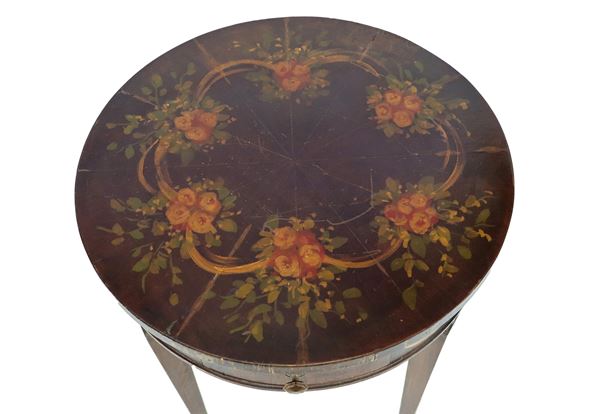 Tavolino tondo da centro francese di linea Luigi XVI in noce, con decorazioni variopinte a motivi floreali, fiocchi e ghirlande