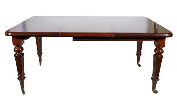 Tavolo da pranzo inglese Vittoriano allungabile in mogano massello, a forma rettangolare con quattro gambe tornite e baccellate, apertura con [..]