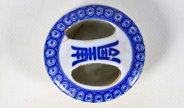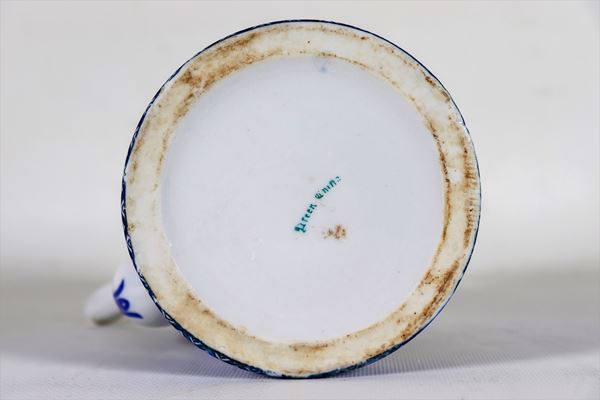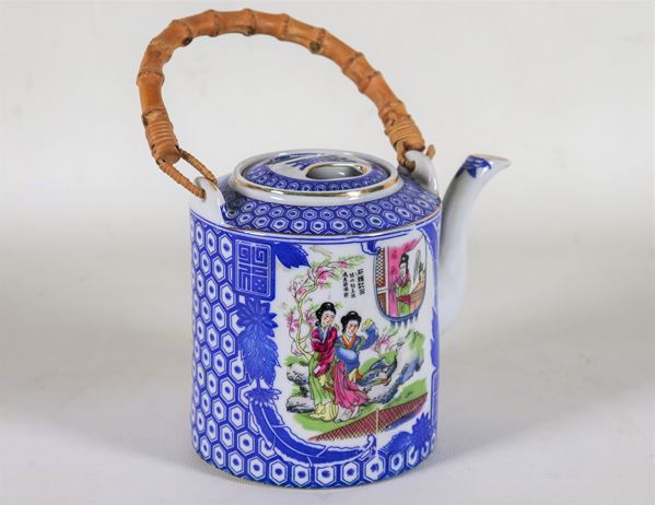 Teiera in porcellana blu, con decorazioni variopinte di scene di vita orientale, manico rivestito in bamboo