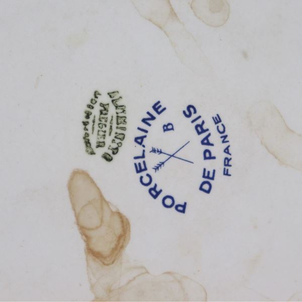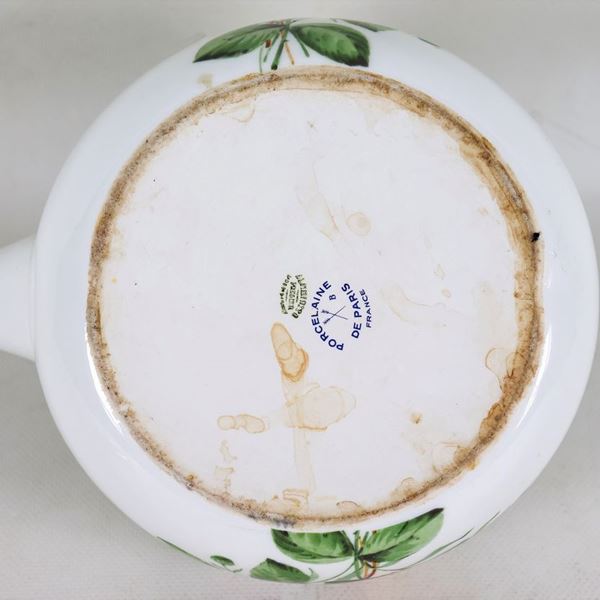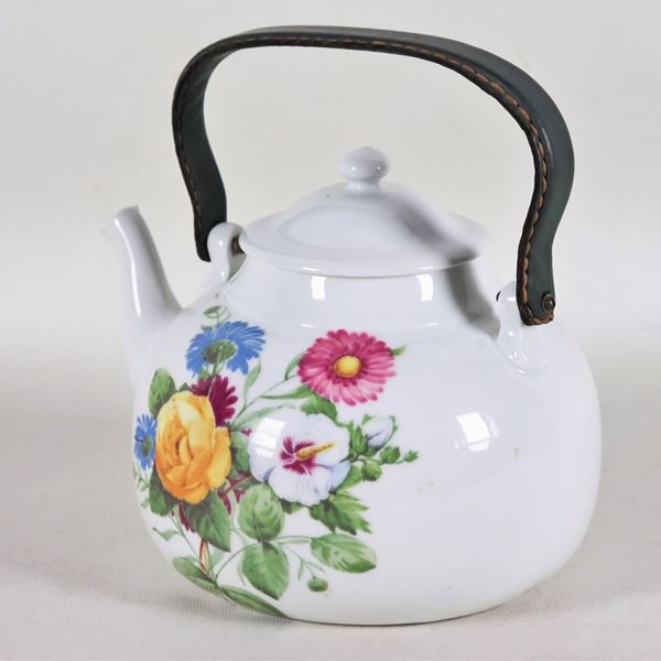 Teiera in porcellana francese, con decorazioni variopinte a motivi di mazzetti di fiori, manico rivestito in pelle