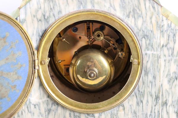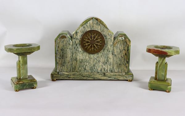 Trittico Liberty di una pendola e due alzate a coppa, in marmo di onice e fregi in bronzo dorato