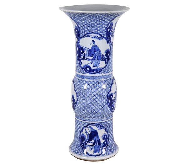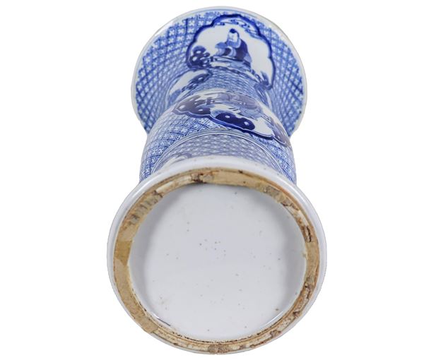 Vaso cinese a tromba in porcellana bianca, interamente decorato in blu a motivi di personaggi orientali
