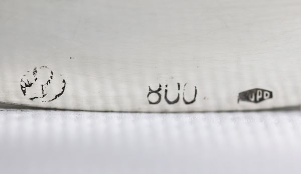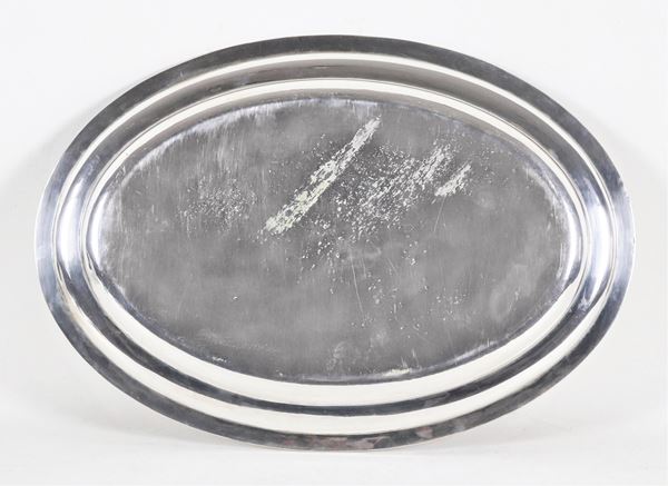 Vassoio ovale da portata in argento con bordo cesellato e sbalzato a motivi Impero, gr. 1160