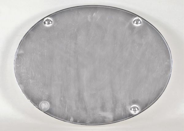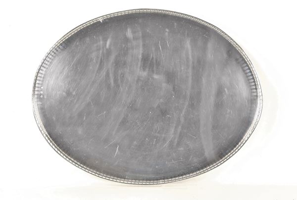Vassoio ovale in metallo argentato con bordo a ringhierina traforata e cesellata a motivi Luigi XVI, mancante di un piedino
